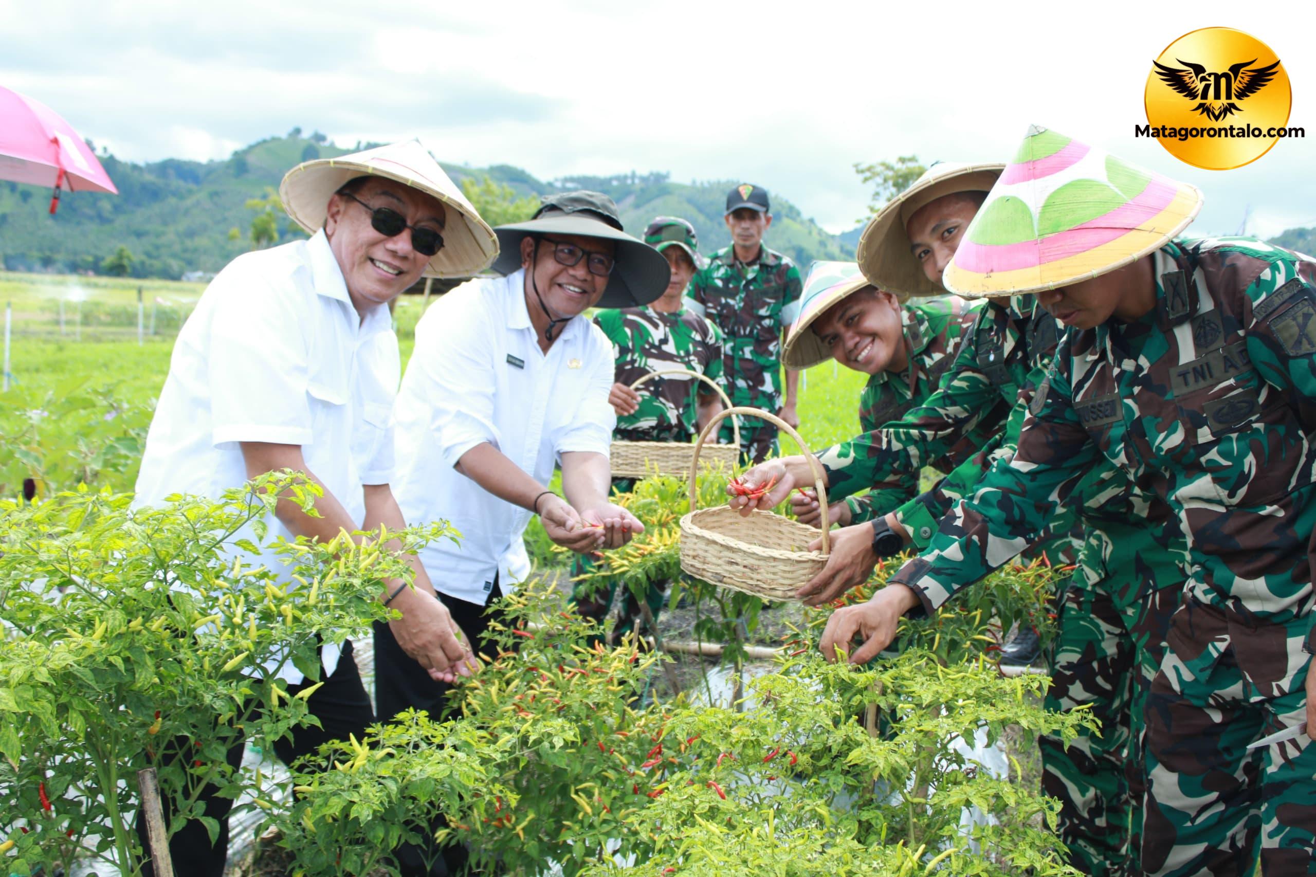 Kegiatan panen bersama tersebut merupakan bagian dari sinergi Pemerintah Provinsi Gorontalo dengan TNI Angkatan Darat dalam mendukung program ketahanan pangan nasional berbasis pemanfaatan lahan satuan. Adapun komoditas yang dipanen pada sektor pertanian meliputi tanaman terong, kacang tanah, ubi jalar, cabai, dan kangkung, yang merupakan hasil budidaya Prajurit Yonif TP 824/MO’E’A melalui program pertanian terpadu.